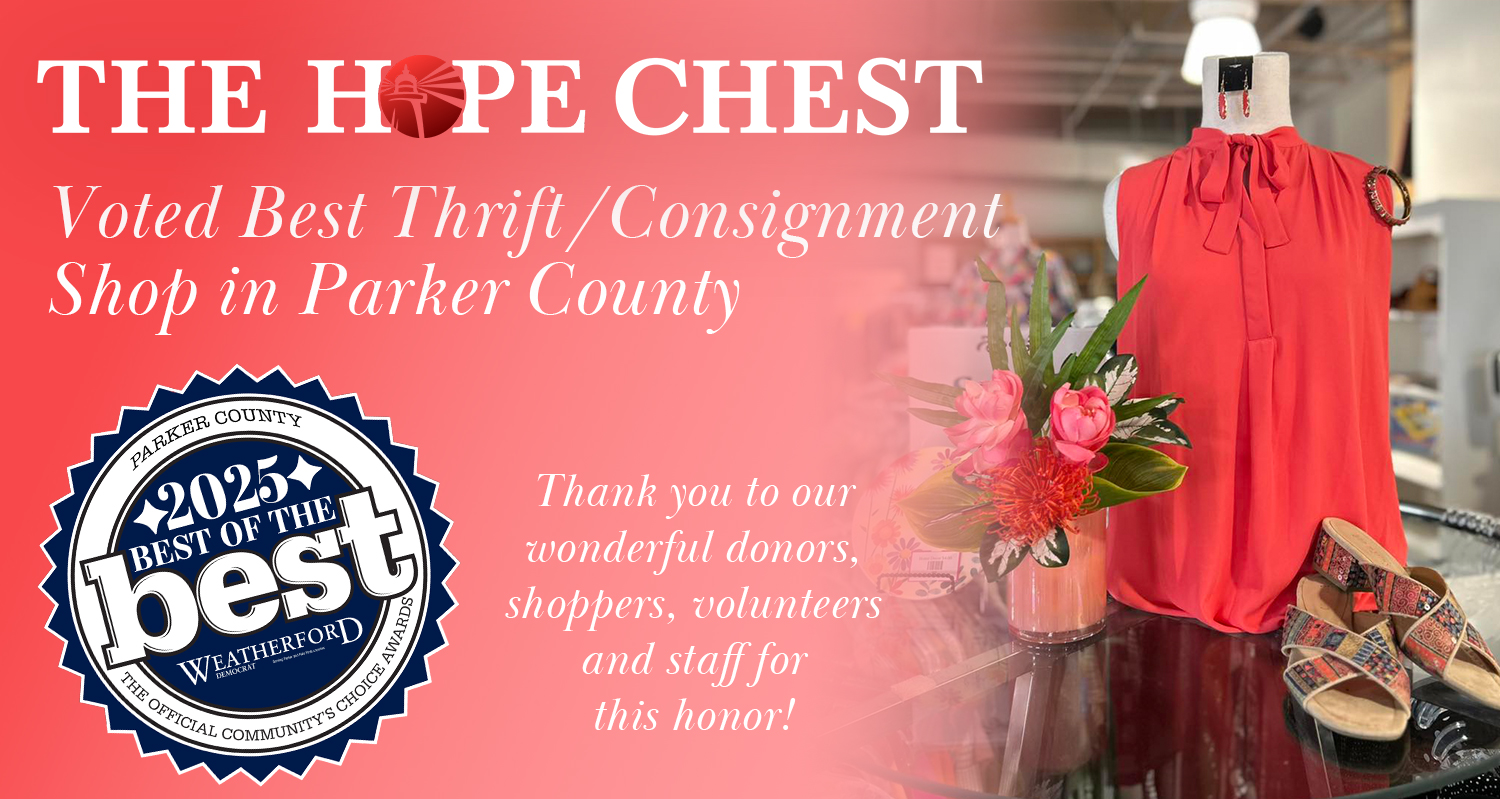 Thank you for donating to The Hope Chest! Your donation is tax-deductible and goes directly to Parker County Center of Hope to help families living in poverty. When donating clothes, please remove hangers and place in either a box or bag. Thanks!